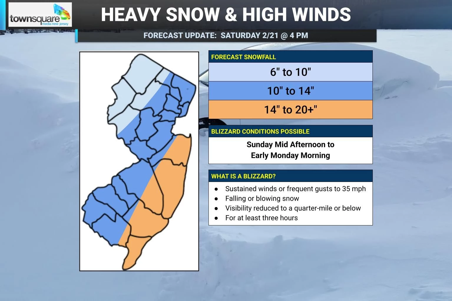 Defining a blizzard... Since many New Jerseyans are confused, I want to offer the official definition of a blizzard once again. It has nothing to do with how much snow falls. It's all about wind, visibility, and dangerous travel conditions. A blizzard occurs when sustained winds or frequent gusts cause blowing or falling snow to cause visibility to drop at or below a quarter-mile for at least three hours. Such conditions are possible almost statewide Sunday night.